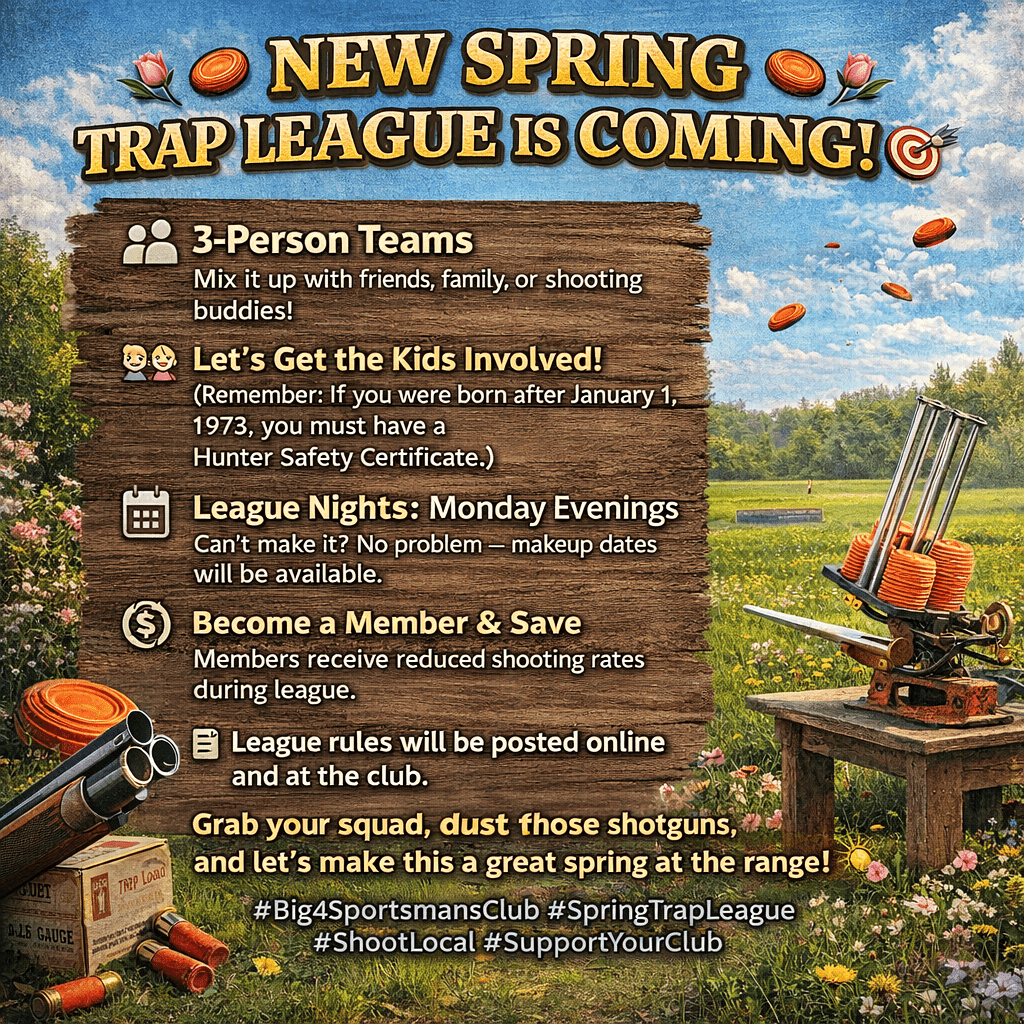 The Big 4+ Sportsman’s Club is a premier trap shooting and outdoor sports club located in Wisconsin’s scenic Northwoods, within the Nicolet National Forest. Founded in 1957, the club began with a small group of dedicated sportsmen and women—and a $1.00 membership fee. Since then, we’ve grown into a welcoming hub for shooters and outdoor enthusiasts from across Wisconsin and beyond.